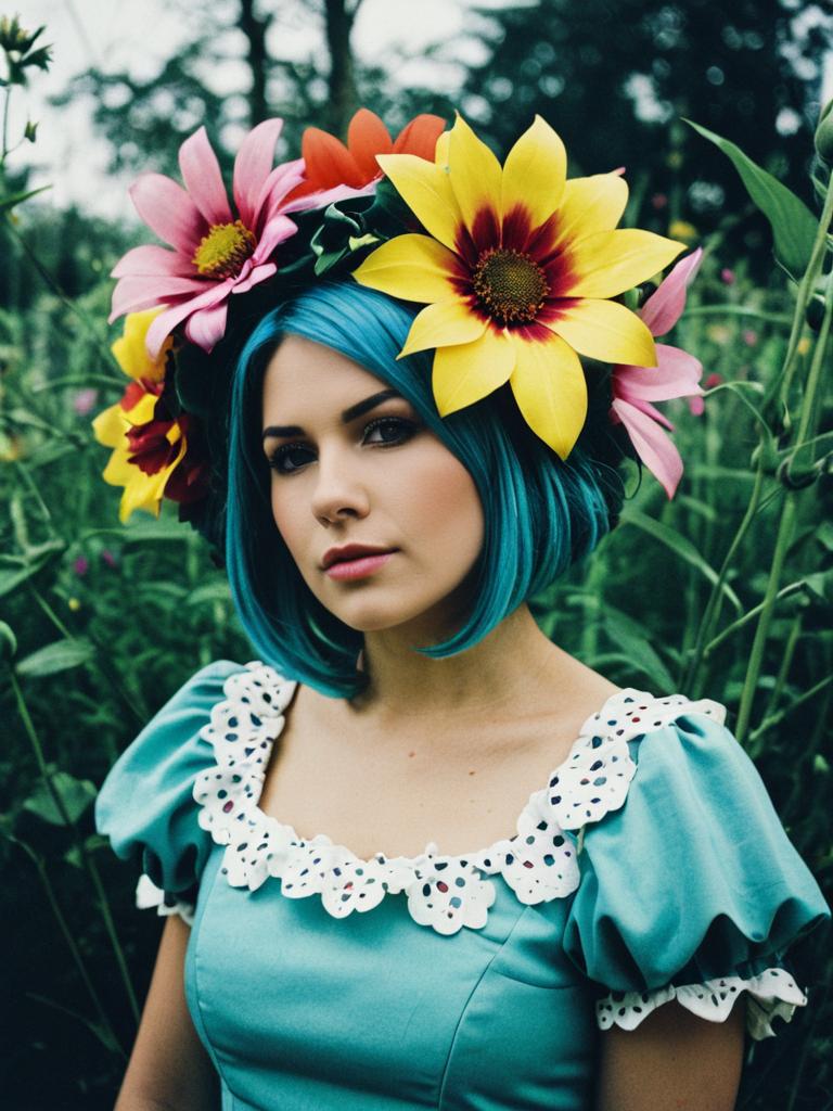 Portrait of a woman wearing a vibrant flower costume featuring a large yellow flower headpiece with red accents and a blue dress adorned with red and white flowers. She has striking blue hair and stands in a field of similarly colored flowers. The image has a cinematic, colorful, editorial cosplay style.