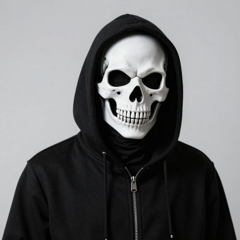 Photograph of a person with a white, stylized skull mask covering their face. The skull has large, black eye sockets, a black nose cavity, and a wide, toothy grin with visible teeth. The person is wearing a black hooded sweatshirt with the hood up, partially shadowing the mask. The background is a plain, light gray, creating a stark contrast with the black hoodie and white mask. The image has a high-contrast, monochromatic style, emphasizing the dramatic and eerie effect of the skull mask. The zipper of the hoodie is slightly visible at the neckline.