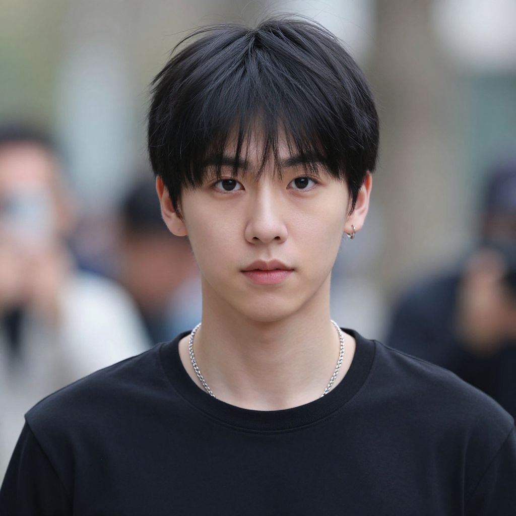 Photograph of an East Asian young man with fair skin and black, slightly messy hair. He has a slender build and wears a white jacket with black collar and cuffs. He has small silver earrings and a silver necklace with a circular pendant. His expression is neutral, looking directly at the camera. The background is blurred, showing indistinct shapes and colors, suggesting an outdoor setting with other people. The image has a soft focus, emphasizing the subject's face and upper body.