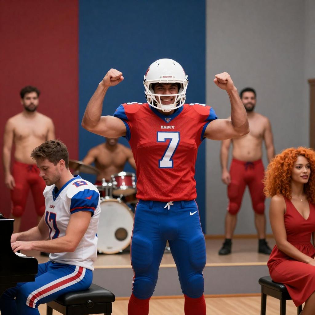 Photograph of a group in a room. Central figure in red and blue football uniform, white helmet, muscular, smiling. To left, man in white, blue, and red uniform, seated at piano. To right, woman in red dress, curly orange hair. Background: four men in red trunks, one with drum set. Red, blue, and gray walls. Central figure's arms raised, fists clenched. Drummer smiling. Pianist focused on playing. Background men standing, casual. Room has a stage-like setup.