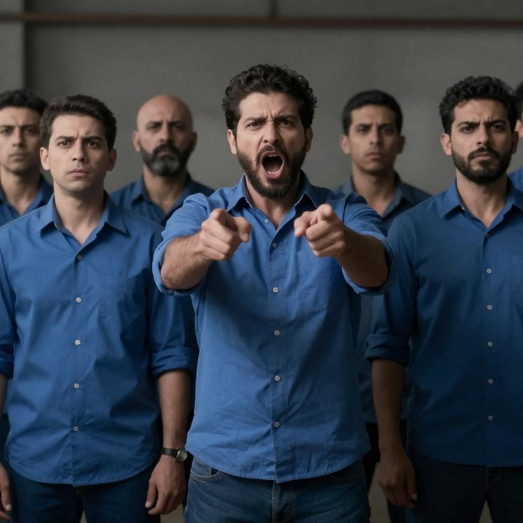 Photograph of a man in a gray tweed suit with a white shirt and black tie, standing confidently among several men in beige overalls and white caps. A red car is partially visible in the foreground. The background features a concrete wall and a dark doorway. The men have serious expressions, and the scene suggests a tense or official situation.