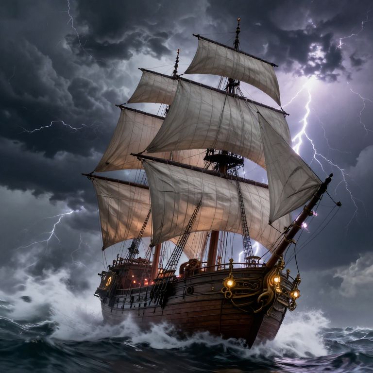 Photorealistic digital illustration of a dramatic, stormy sea scene featuring a large, wooden, 18th-century sailing ship with billowing white sails. The ship, illuminated by glowing yellow lights, navigates turbulent, dark blue waves. A vivid, electrifying lightning bolt strikes the dark, cloudy sky above, illuminating the scene with white light. The ship's rigging and masts are detailed, with ropes and sails showing realistic textures. The background is filled with dark, menacing clouds and intense, swirling storm energy. The overall mood is tense and dramatic, capturing the power of nature and maritime adventure.