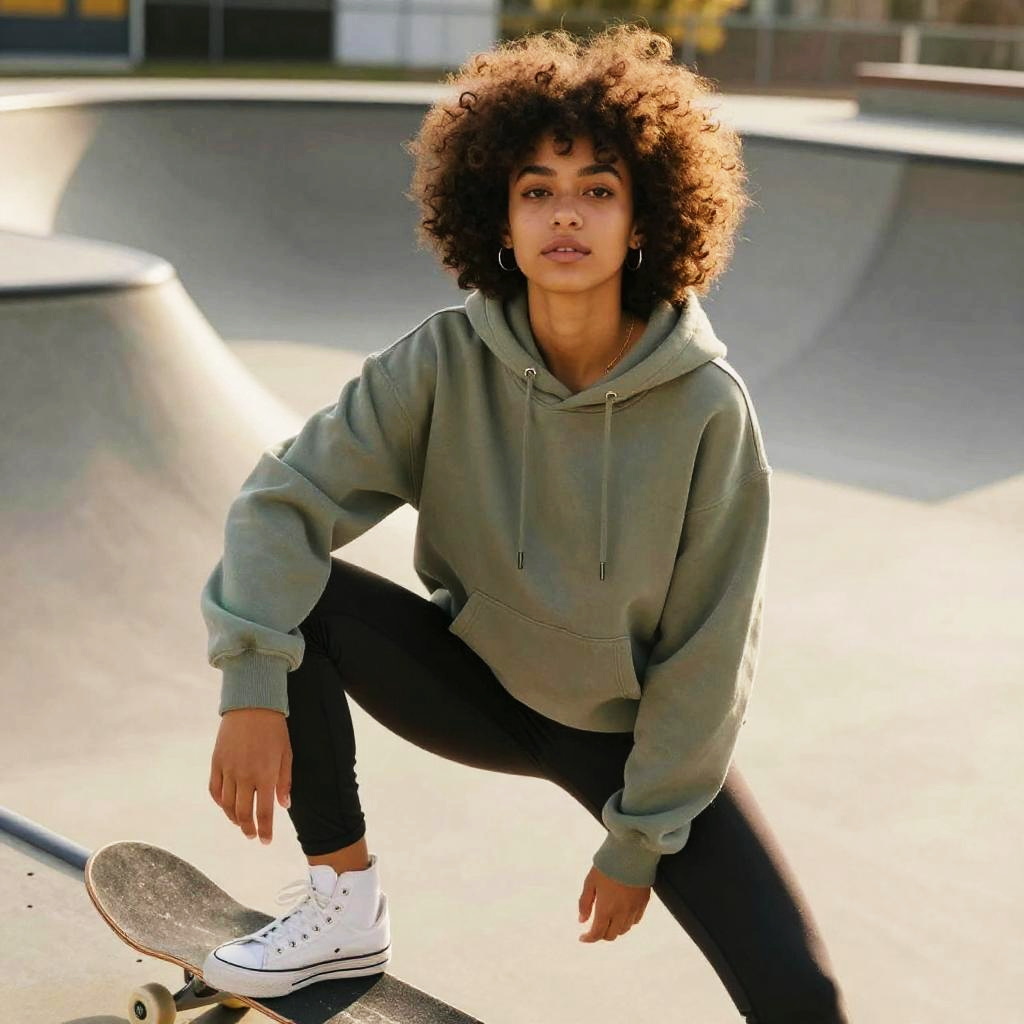 Drop Fade Afro hairstyle on young woman, wearing casual hoodie and leggings, in skate park, captured in fashion editorial style with warm afternoon sunlight.