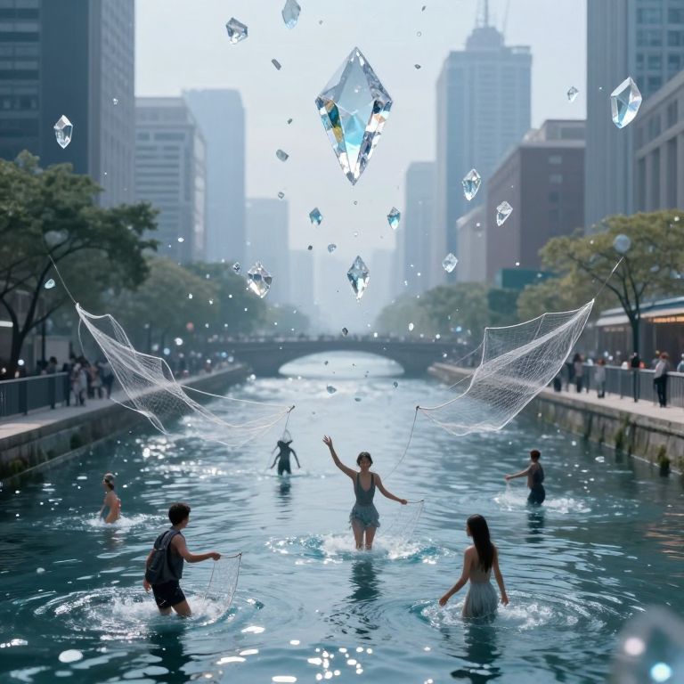 In a city where time drifts like ethereal crystals suspended in the air, citizens wade through shimmering glass rivers, casting nets for fragments of past and future, their souls entwined in the delicate dance of memory and hope.