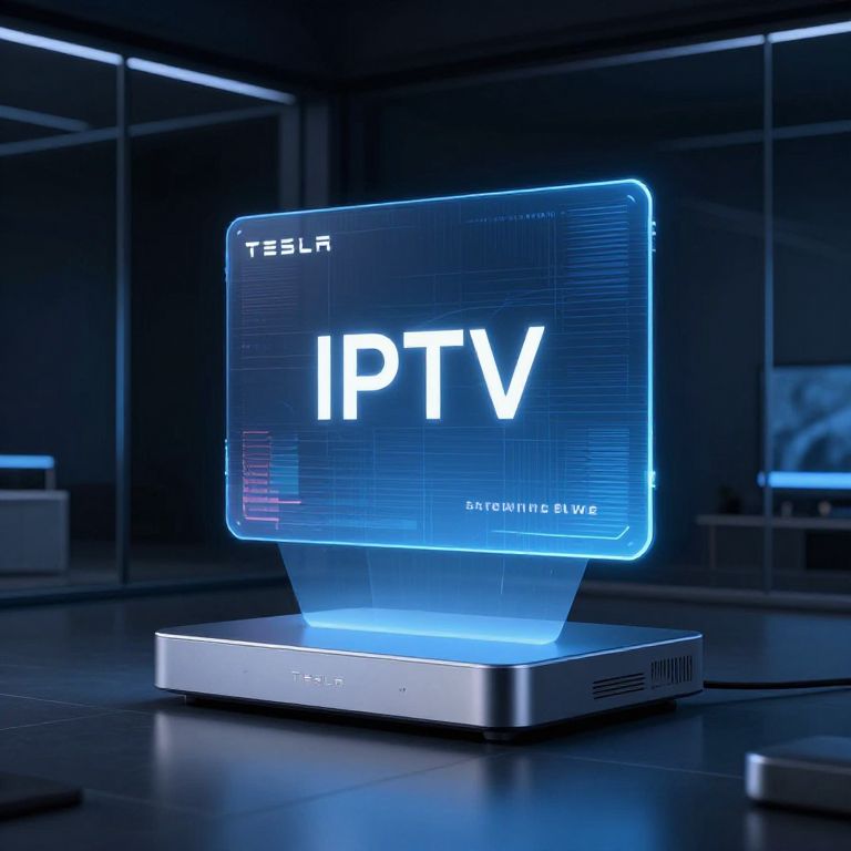 Photograph of a futuristic Tesla IPTV display with a glowing blue screen, showing "IPTV" in bold white letters, standing on a sleek