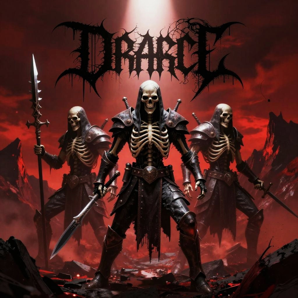 Dark death metal aesthetic, skeletal warriors in battle gear under a blood red sky, jagged mountains, dripping black ink effects, dramatic spotlight, intense aggressive vibe