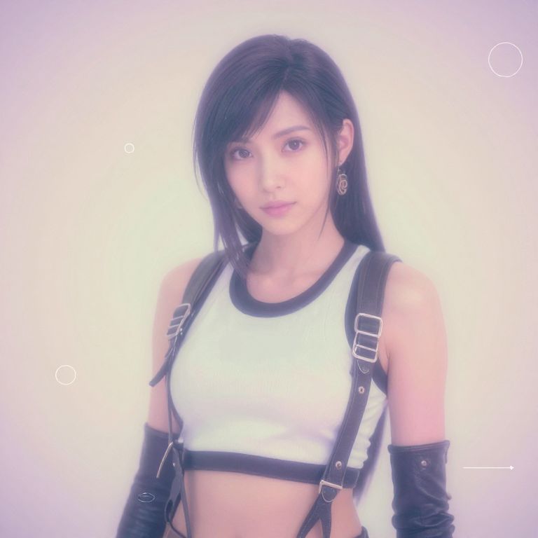 In this Lomography-inspired photograph, Tifa Lockhart from Final Fantasy is portrayed in a hazy, dreamlike, and liminal minimalist setting, The muted colors, reminiscent of faded pastel hues like lavender, peach, and mint, evoke the feel of a bygone era, as if they have been softened by the patina of time, This nostalgic atmosphere is further enhanced by the early 2000s web aesthetic, while the cinematography of Asteroid City adds a touch of surrealism to the scene, The minimalist surrealism is complemented by a chromatic glossy shimmer, lending an air of eldritch strangeness to the scene, Delicate vector outline accents are scattered throughout the image, adding depth and dimension to the otherwise simplistic composition, This unique and evocative photograph masterfully combines various visual elements to create a captivating and enigmatic portrait of Tifa Lockhart