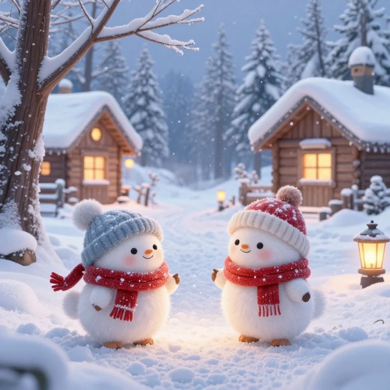 Fluffy's winter wonderland, a snowy landscape with fluffy snowdrifts and frosted trees, adorable fluffy animals wearing scarves and hats playing in the snow, cozy cabins in the background, glowing lanterns lighting the scene, atmospheric and detailed artwork.