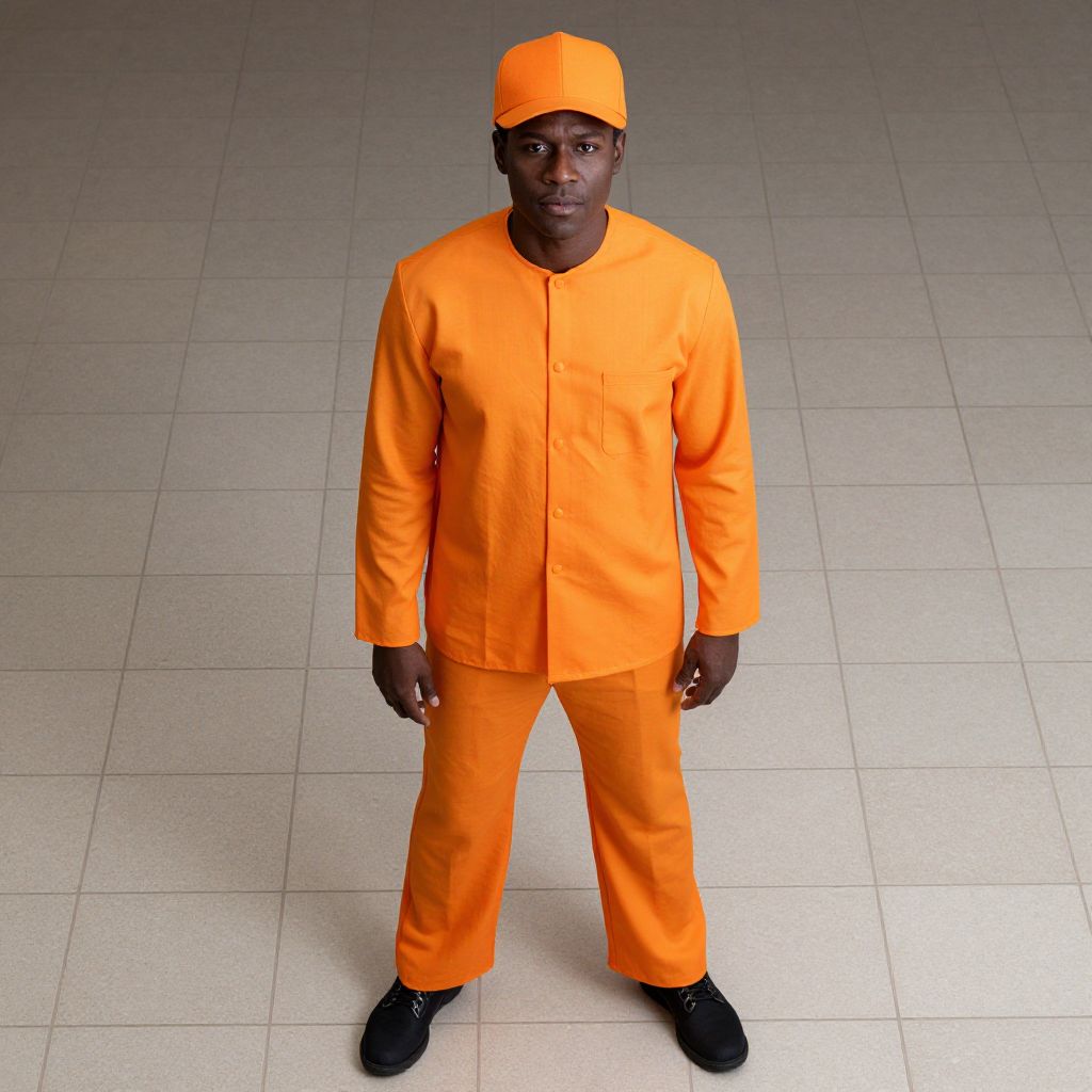 Orange Crush Costume, man in an orange outfit standing on a tiled floor