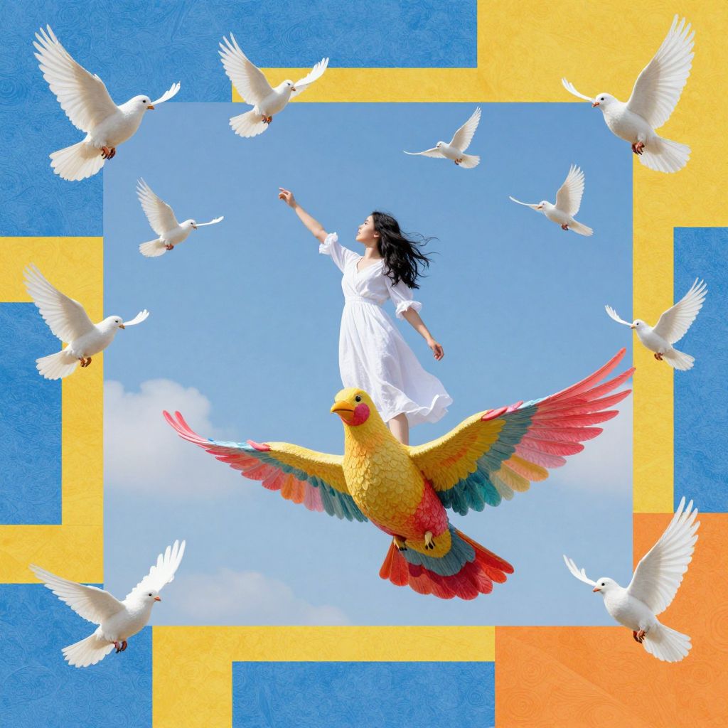 Woman perched atop a vibrant, fantastical bird soars through a surreal sky, surrounded by seven white doves and framed by a patchwork backdrop of blue, yellow, and orange panels, evoking a dreamlike journey between realms.
