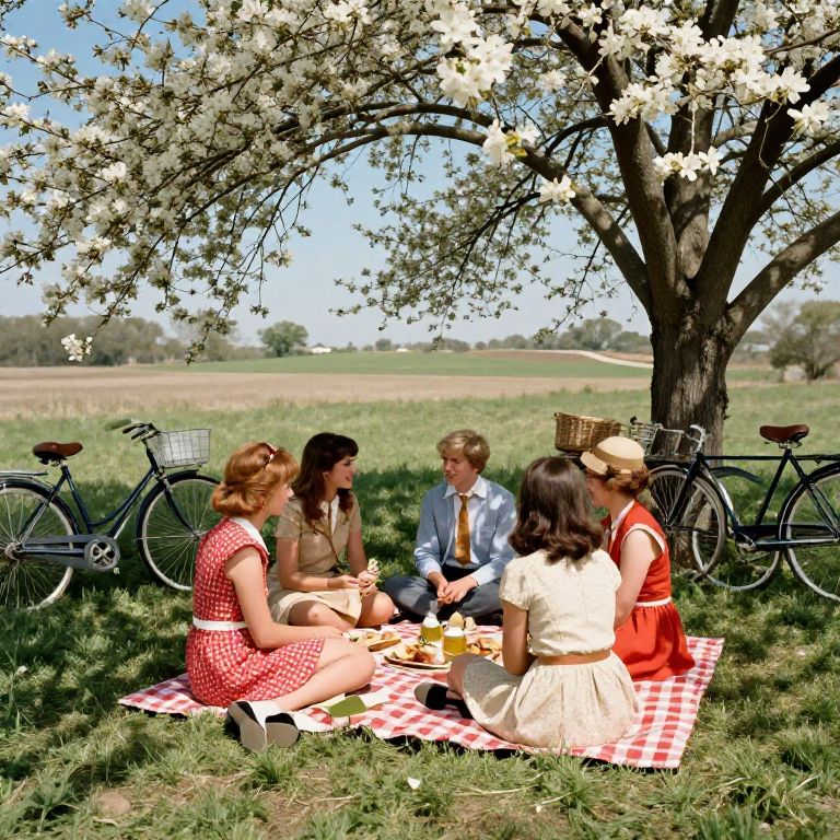 1968 peaceful countryside picnic with people dressed in 60s attire, sitting on checkered blankets under blossoming trees, retro bicycles leaning nearby, bright clear sky with soft sunlight, evoking nostalgia of 1968 summer days.