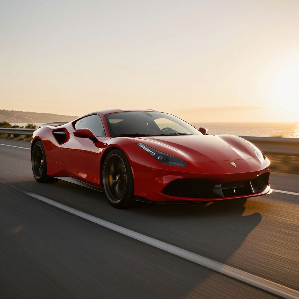 Expensiv sports car speeding along a coastal highway during sunset, polished metallic surface gleaming under warm golden light, sleek aerodynamic design with vibrant red color, showcasing power, elegance, and ultimate luxury on wheels.