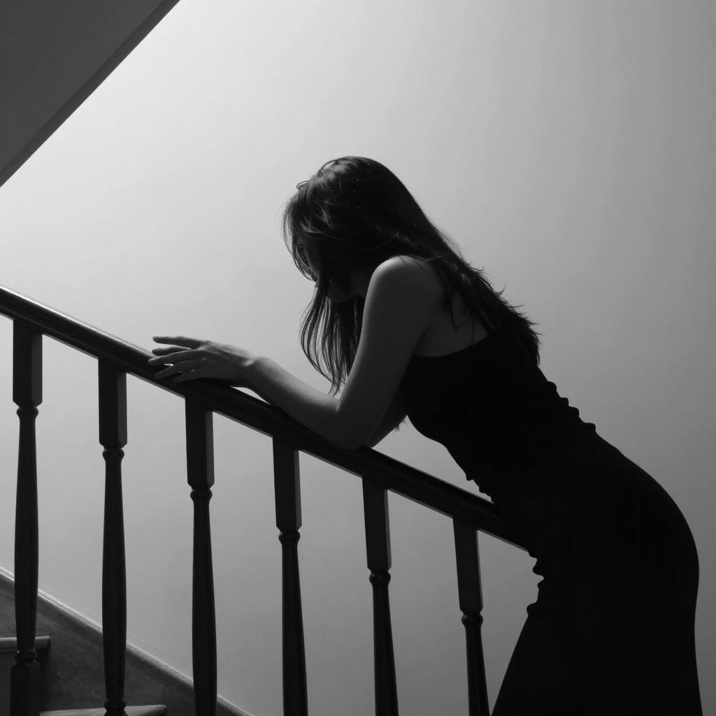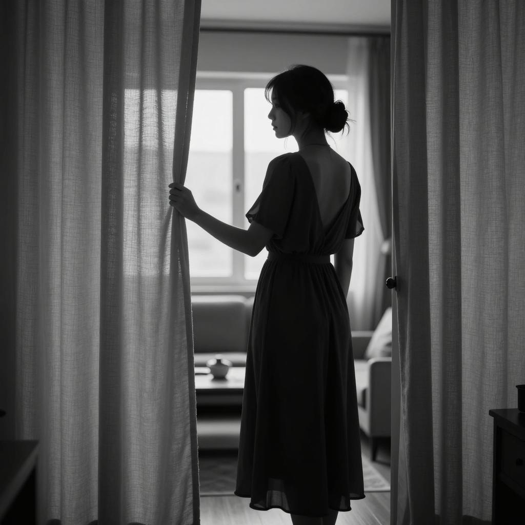 Black and white photograph of a woman sitting with her legs crossed, viewed in profile. She's silhouetted against a large, bright circular light source in the background. Horizontal window blinds cast striped shadows on her body. Her hair is in a bun, and she's wearing minimal clothing. The camera angle is slightly low, capturing her from the side. The background is blurred, creating a shallow depth of field that focuses on her silhouette and the light patterns. The lighting is dramatic, emphasizing the shadows and contours.