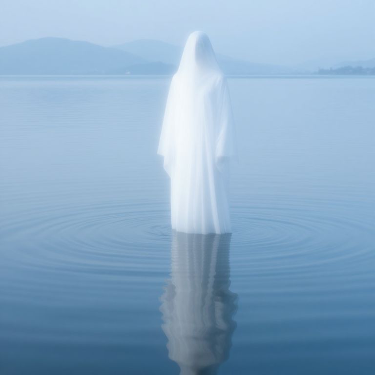 A spectral figure cloaked in ethereal white stands motionless upon a tranquil lake, its reflection rippling into an otherworldly mirror that blurs the line between reality and the unseen.
