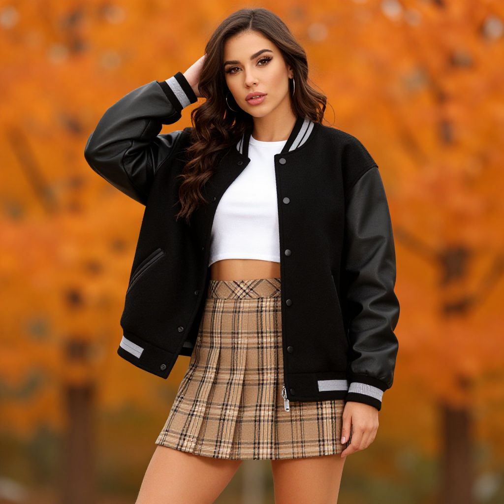 A stylish woman poses confidently in a black varsity jacket paired with a white crop top and a plaid mini skirt. The autumn background, adorned with vibrant orange leaves, perfectly complements her chic look, capturing a youthful spirit and seasonal fashion trends.