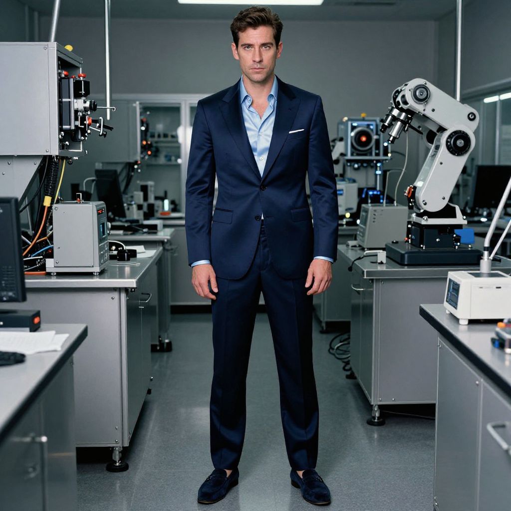 A man, navy blue satin suit, fitted blazer, light blue silk shirt, navy suede loafers, robotics lab, sleek metal surfaces, buzzing machinery, Cibachrome style, confident expression. Man has masculine face and piercing eyes