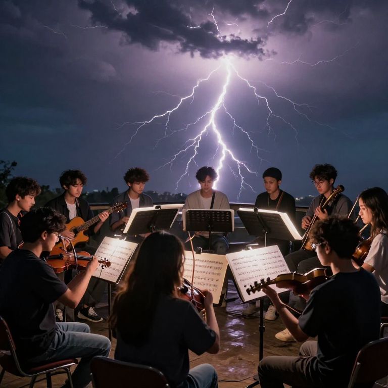 Under a tempestuous sky, a circle of youthful musicians transforms the raw energy of lightning into harmonious melodies, weaving a symphony of hope and unity amidst the chaos.