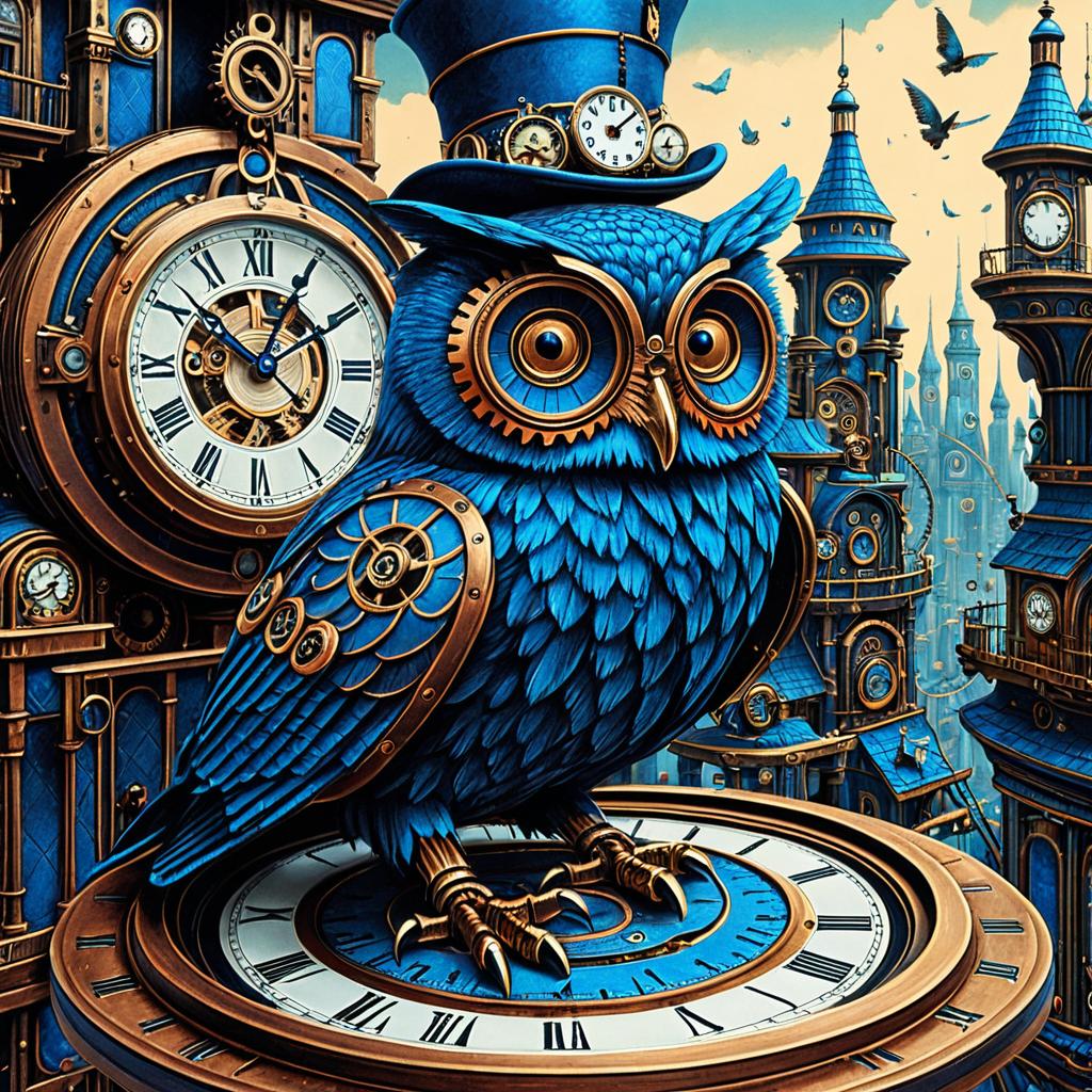 A detailed steampunk-themed image of a vibrant cobalt blue clockwork owl adorned with multiple clocks and gears, set in a floating cityscape. The owl features metallic copper and brass accents, with clocks integrated into its eyes, chest, and top hat. The surrounding architecture includes tall towers and clock faces in copper and blue tones, with a sky filled with birds, creating an intricate and illusionistic trompe-l'œil effect inspired by classic fantasy and mystery novel styles.