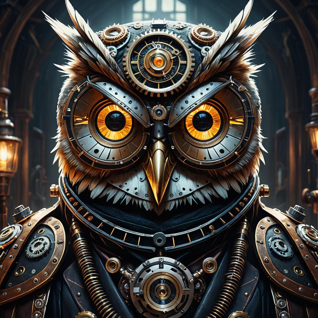Azure clockwork owl in a steampunk mystery novel set in a floating city rendered with trompe-lœil illusionistic detail, clockpunk accents, familiar domestic scenes and lively tableaus in the style of Evgeni Gordiets and Joe Jusko, tinted in vibrant cobalt blue and copper tones.