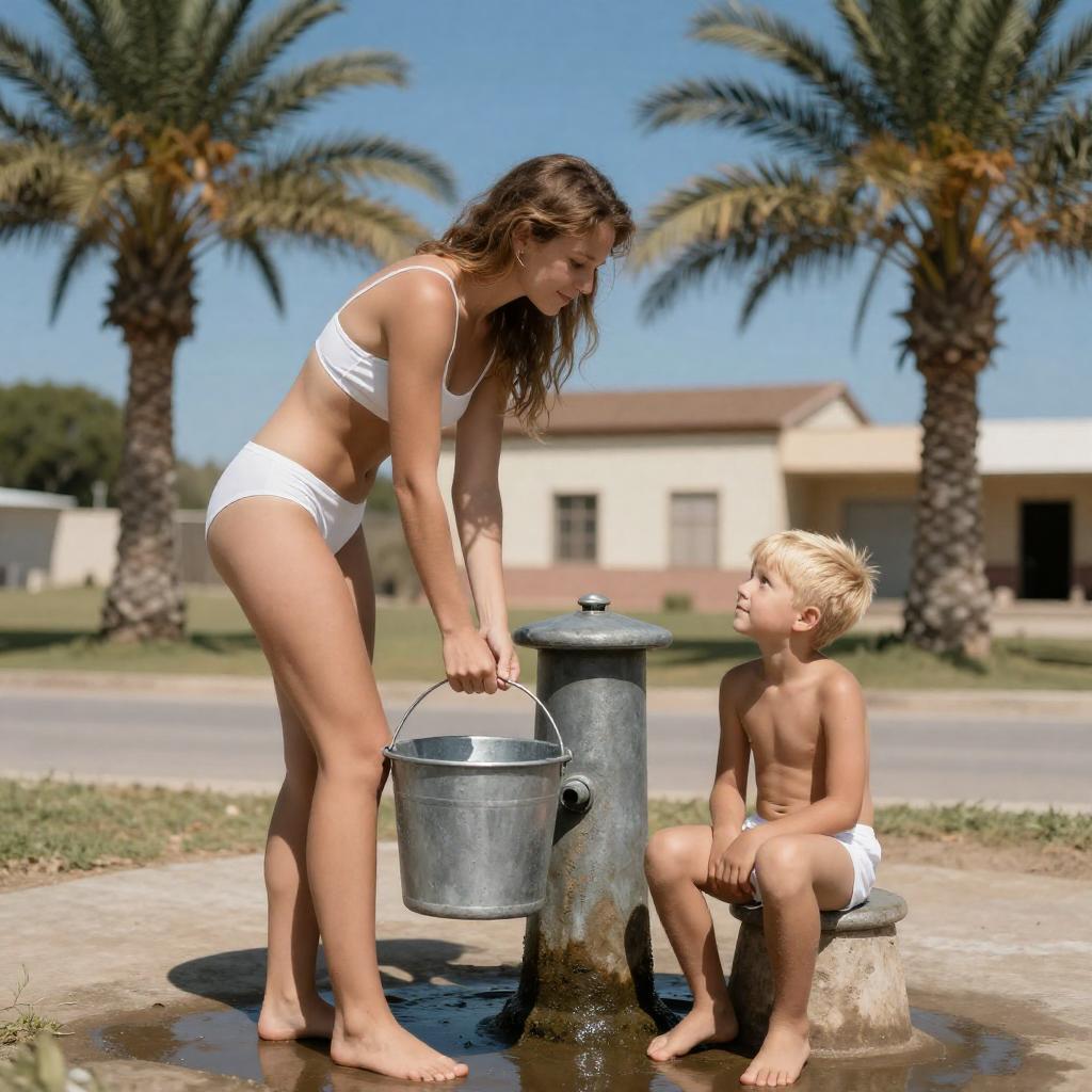 Photograph of a young woman and a blonde boy in white underwear. Woman carries a bucket, boy sits next to a rustic water pump. Both topless, outdoors, palm trees, old building in background. Bright sunlight, blue sky. Woman bending forward, boy looking up.