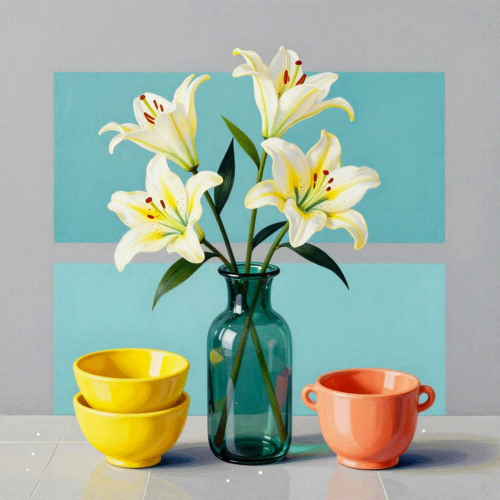 A digital art styled as gouache with bold outlines of lilies in a deep emerald glass vase alongside stacked yellow ceramic bowls and a coral pot. Set against geometric cyan rectangles overlaid on a muted gray wall with scattered white dots on a tiled floor. Playful modern still life, Memphis-inspired geometry, saturated yet balanced color, clean negative space, high detail, crisp edges, soft studio lighting, cohesive composition.