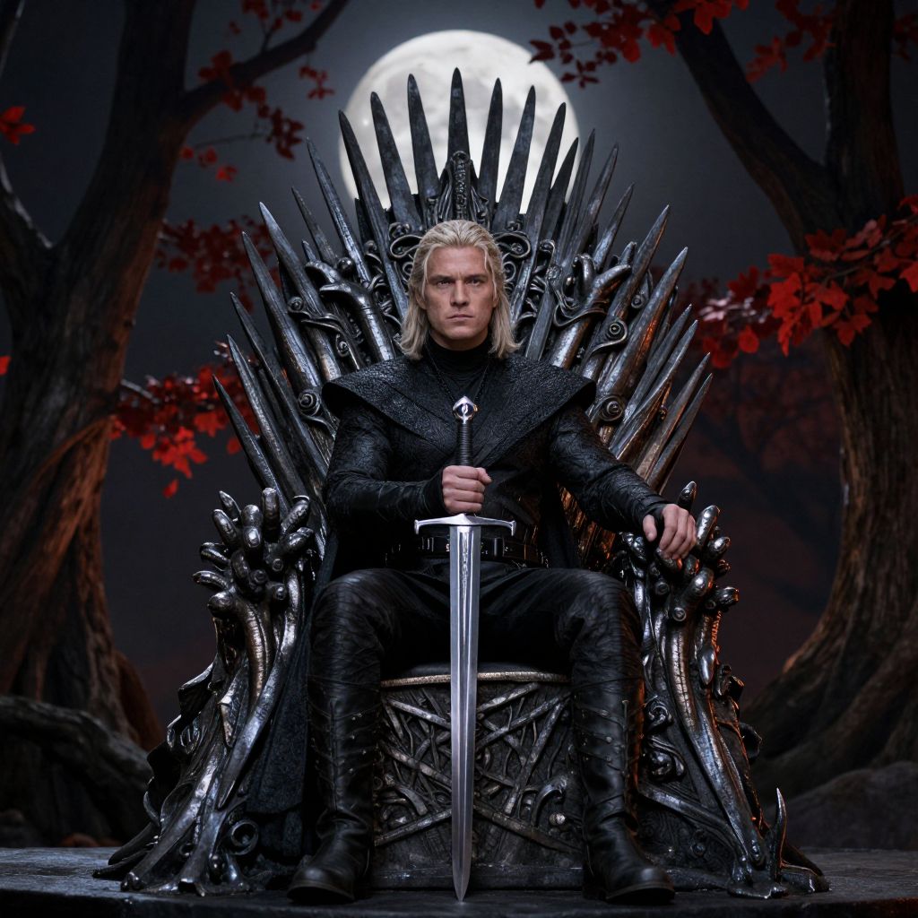 Photograph of a blonde man with long hair, wearing a black, spiked Iron Throne-like chair, holding a sword, under a full moon in a