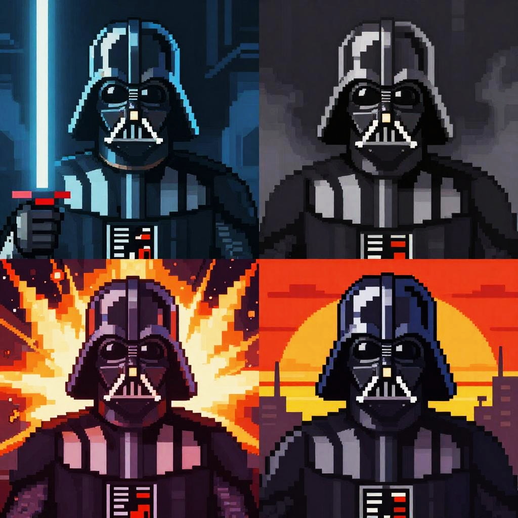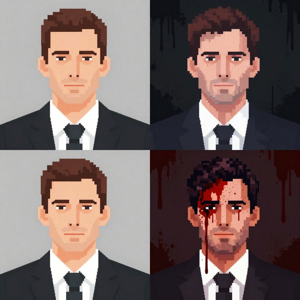 This is a pixel art collage featuring six portraits of a muscular, brown-haired man with a serious expression, wearing a dark blue, button-up shirt with suspenders. The top left and bottom left images show him with a glowing halo, the top right and bottom right images show him with a fiery background, and the center image shows him against a dark, starry sky. His shirt is detailed with buttons and pockets, and his hair is slightly tousled. The pixelated style gives a retro, 8-bit video game aesthetic. The background colors range from dark blues and blacks to warm oranges and yellows.