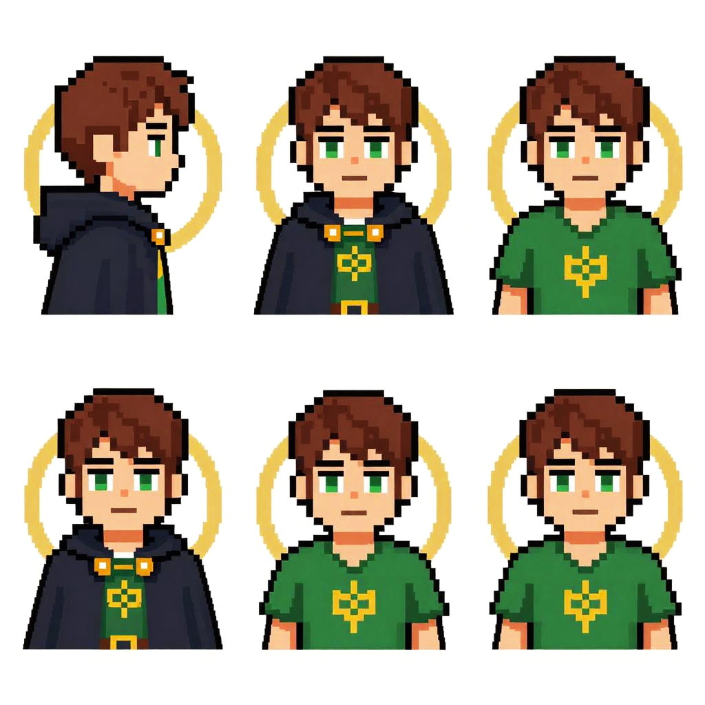 Pixel art collage of six male characters, each with varying expressions and backgrounds, wearing dark shirts with straps, featuring glowing halos and fiery effects.