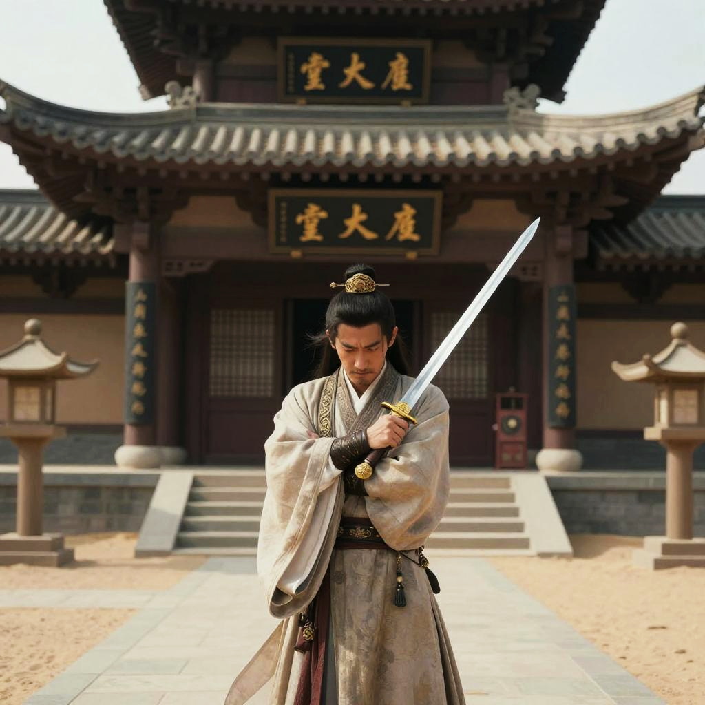 Male warrior with dark hair, green and black armor, sitting on stone steps, clenched fist near mouth, intense expression. Ornate stone carvings, statues, and dark, mystical background. Warm light from right. Warrior's right leg bent, left arm resting on knee.