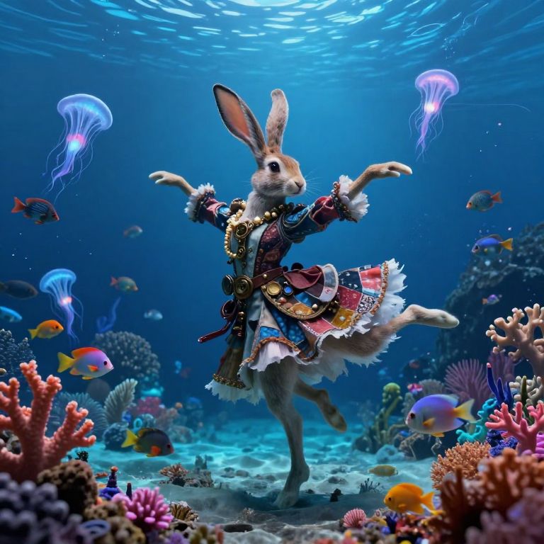 An enchanting underwater dreamscape showcases an enigmatic creature engaging in a mesmerizing dance with bioluminescent sea creatures. The fantastical Basil Stag Hare, adorned in a patchwork ensemble evocative of steampunk aesthetics, gracefully pirouettes through the deep blue waters, his elongated ears swaying as he moves. Vibrant coral reefs and exotic fish create a captivating backdrop, reminiscent of a fantasy painting that fuses underwater flora and fauna with the whimsical creature. This imaginative fusion elicits a sense of wonder and enchantment, transporting viewers to an extraordinary realm where reality intertwines with dreams, much like the surreal works of renowned artists who explore the boundaries between these worlds.