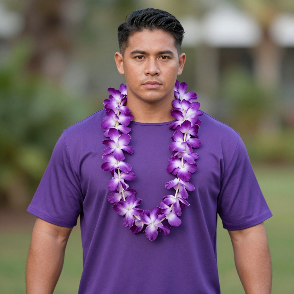 Purple Toga Costume, man wearing a purple lei lei and a purple shirt