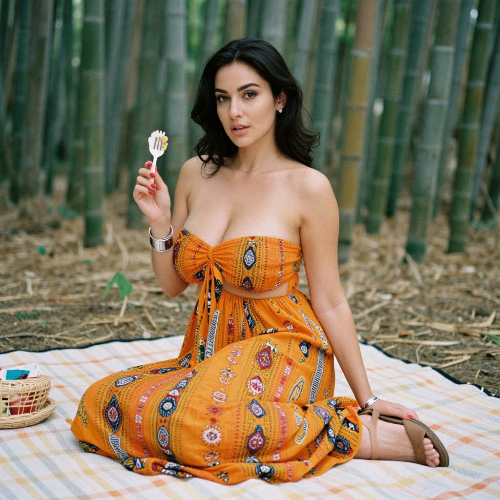 A woman in a vibrant orange strapless maxi dress with ethnic patterns, flat brown sandals, and a silver bangle, captured in an instant film style, enjoying a picnic in a bamboo grove. Sexy. Pretty face and beаutiful eyes. Big breasts