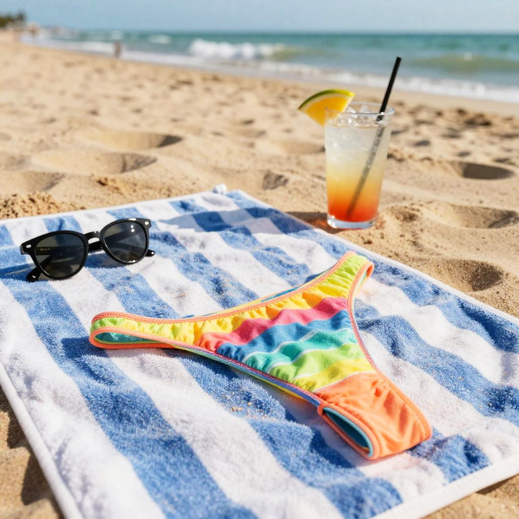 A bikini tied up with intricate knots, displayed on a sandy shore, sun hats and seashells scattered nearby, bright and colorful beach scene, soft breeze visible in the fabric, vivid and crisp summer atmosphere, highly detailed and immersive.