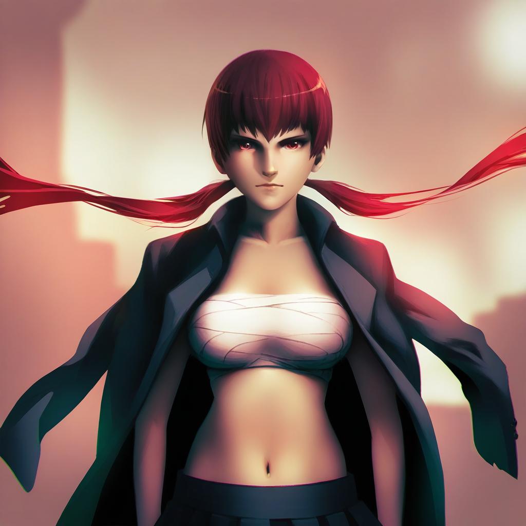 This digital artwork portrays a strong, anime-style woman with short, red hair and red ribbon-like extensions. She has a determined expression with dark, intense eyes. She wears a black, open jacket over a white bandeau top that reveals her midriff. The background is a blurred, gradient mix of pink and white, creating a dramatic, spotlight effect. The artwork uses bold, contrasting colors and sharp lines, emphasizing her confident, powerful presence. The lighting highlights her facial features and the texture of her hair and clothing.