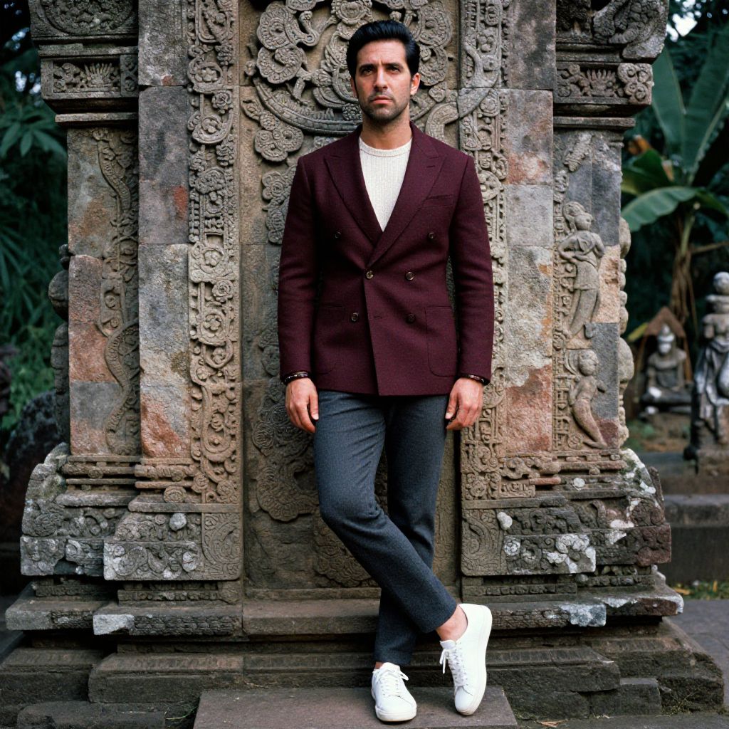 A man, black hunting boots, patterned wool socks, burgundy henley shirt, charcoal wool blazer, black chinos, ancient stone temple, intricate carvings, surrounded by lush greenery, kodachrome analog film, contemplative expression. Man has masculine face and piercing eyes