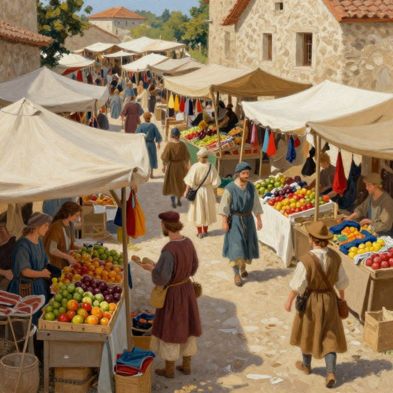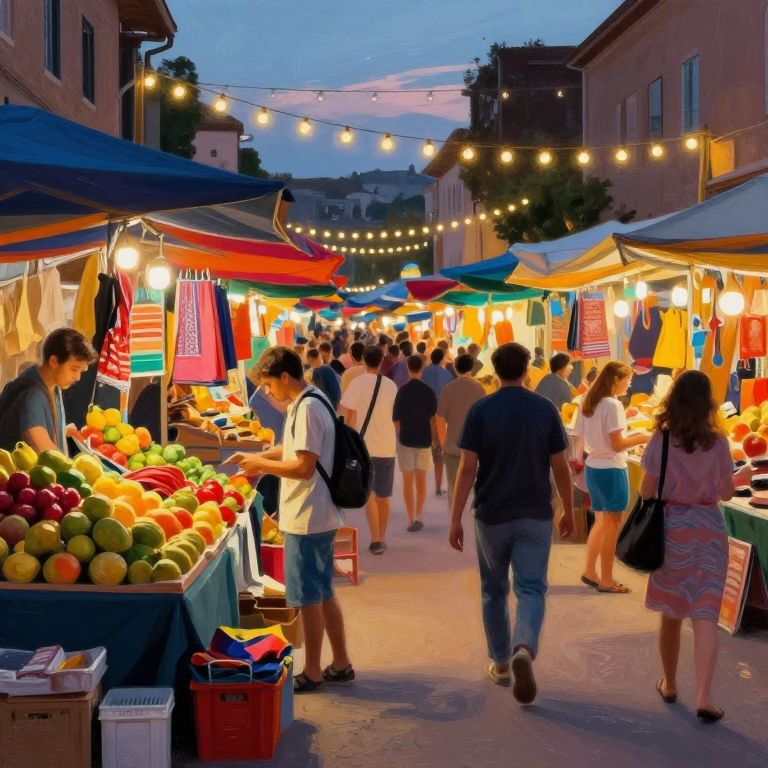 Colorido festive street market scene bustling with people wearing colorful clothing, stalls overflowing with bright fruits, flowers, and textiles, warm sunlight casting dynamic shadows, lively atmosphere, painterly style with rich texture and depth.