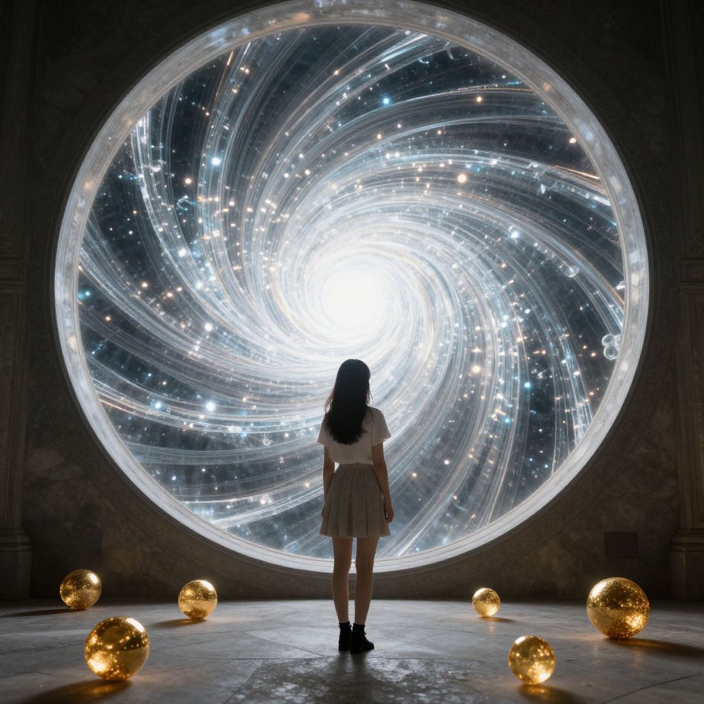 Photograph of a young woman with long black hair, wearing a white blouse and beige skirt, standing with her back to the camera. She faces a large, glowing, swirling vortex of lights that fills the dark background. Surrounding her on the floor are several golden, spherical objects that reflect light. The vortex is illuminated with white and blue lights, creating a mesmerizing, almost ethereal effect. The scene has a magical, otherworldly vibe, with the woman's small figure contrasting against the large, luminous swirl behind her. The floor is dark and textured.