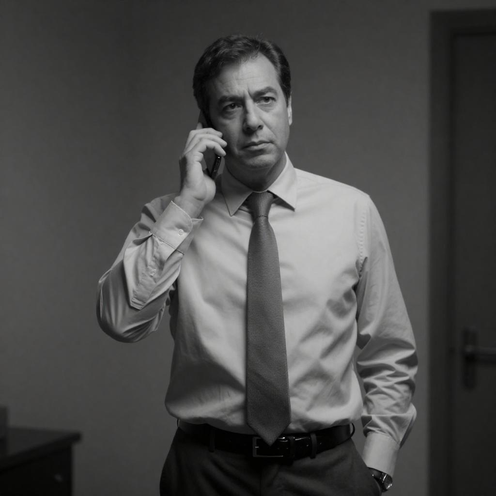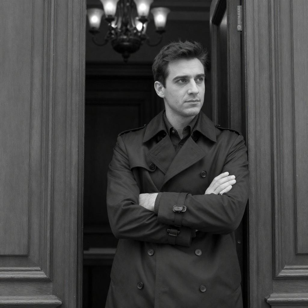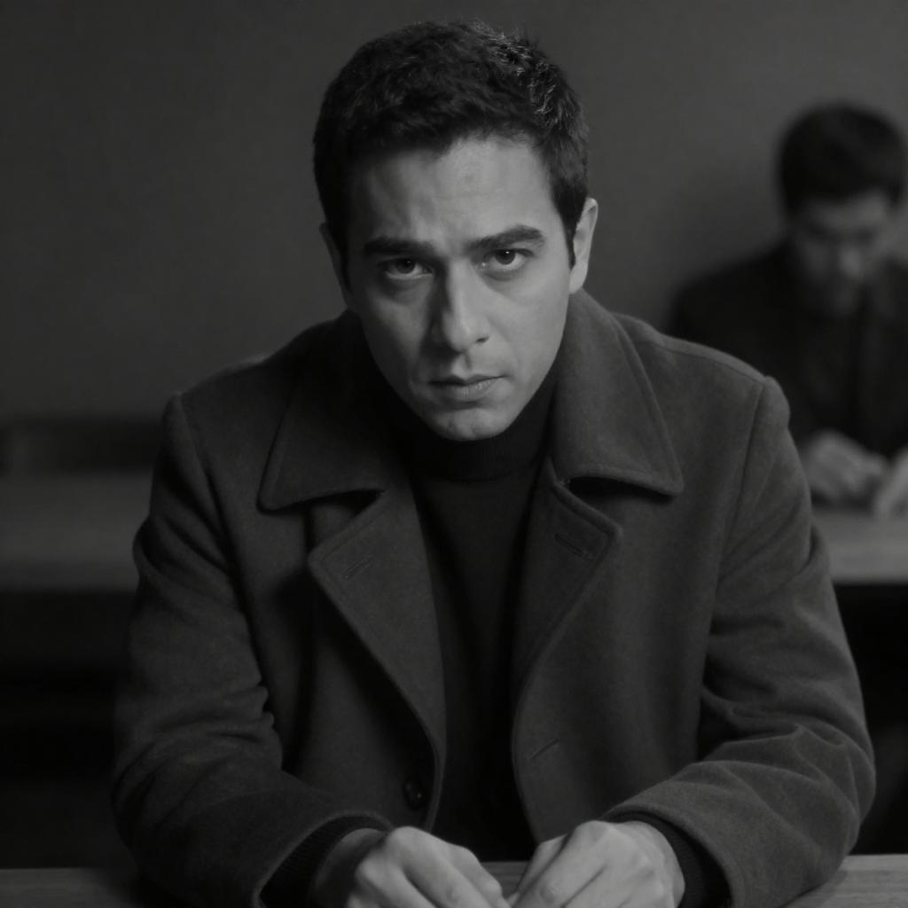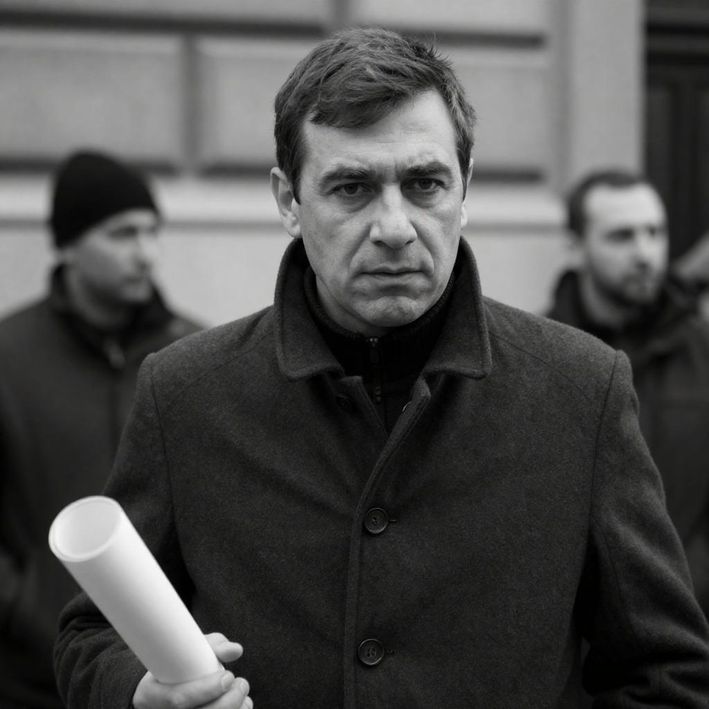 Black and white photograph of a middle-aged man with short, dark hair, holding a rolled-up paper in his right hand. He wears a dark coat with a high collar. Background shows two blurred figures, one wearing a hat, and a stone wall. Intense expression on the man's face.