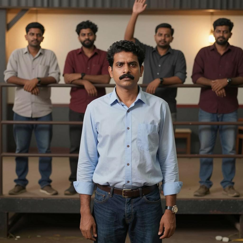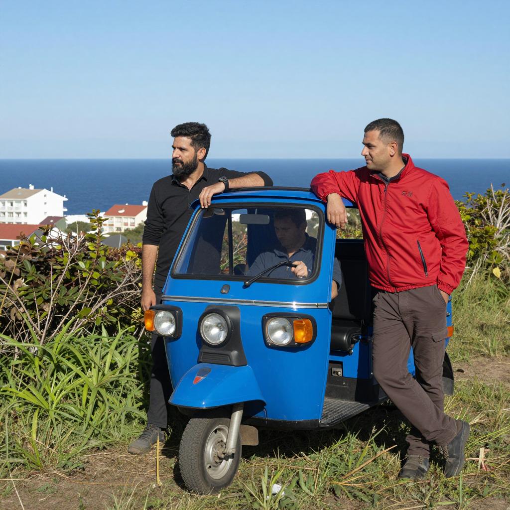 Two men riding a blue motorcycle with a sidecar in a narrow urban street. The man in the sidecar wears a green shirt and sunglasses, the driver wears an orange shirt and sunglasses. A third person in a patterned outfit rides a bicycle to the left. Buildings with weathered facades and closed shutters line the street. The driver's expression is neutral, the sidecar passenger's expression is relaxed.