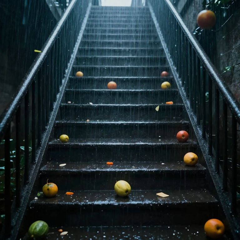 Photograph of a rain-soaked staircase with apples and oranges falling from above, illuminated by a bright light at the top.