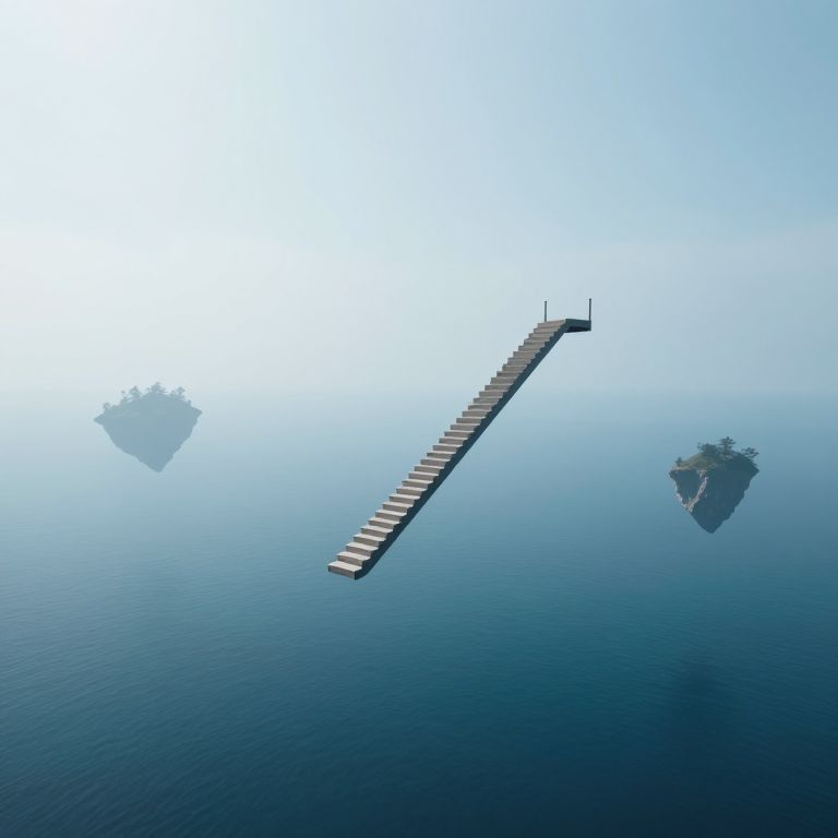 Suspended between earth and sky, a solitary staircase ascends from the depths of the ocean, inviting contemplation amidst the ethereal stillness of floating islands, where the whispers of solitude and the promise of transcendence intertwine.