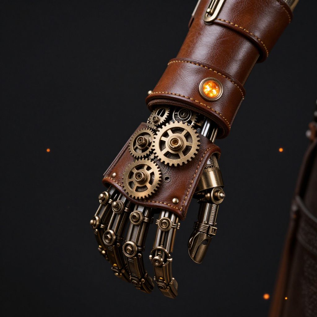 8b4513 color focus, an elegant steampunk mechanical arm with intricate gears and polished saddle brown leather straps, glowing amber lights embedded, on a dark background with subtle sparks, high detail and depth.