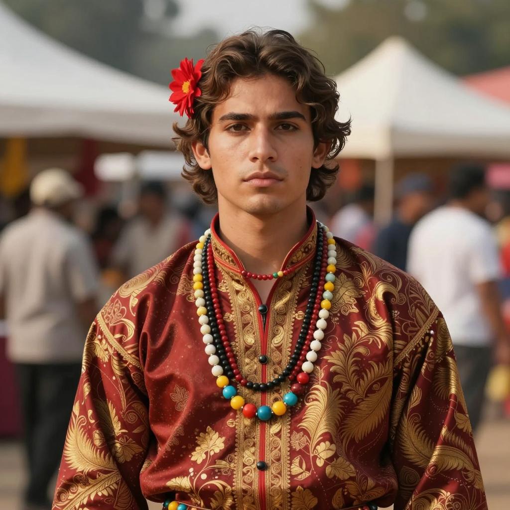 Portrait of a young man with curly brown hair and light skin. He has a slight stubble and wears a long-sleeve beige button-up shirt with the sleeves rolled up. He is also dressed in brown pants with a belt, standing in front of a worn beige wall. The lighting is warm and natural, emphasizing a casual yet slightly historical fashion style. The image is centered, with the subject showing a serious expression, captured in a medium upper body shot.