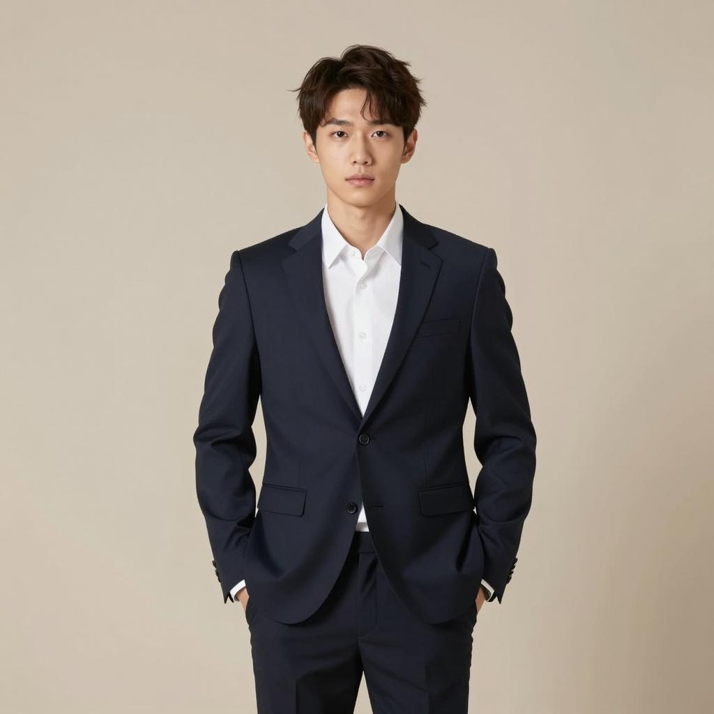 Portrait of a young Asian man standing against a beige background. He has short dark brown hair and a neutral expression. He is dressed in a dark blue suit jacket over a white dress shirt with his hands in his pockets. The lighting is soft, creating a minimalist and professional look.