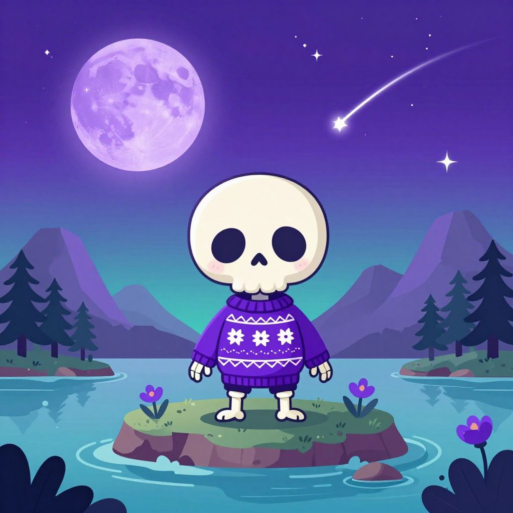 Vector illustration featuring a cute skeleton wearing a purple holiday jumper standing on a small island at night. The background includes a large purple full moon, starry sky with a shooting star, and a gradient from purple to teal. Surrounded by mountains, pine trees, and purple flowers by the water's edge, the scene is highly detailed and atmospheric.