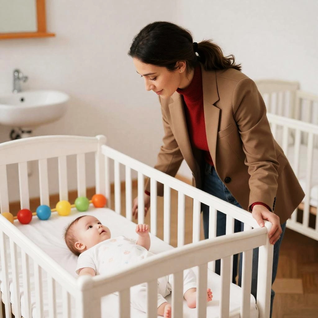 Photograph of a woman with dark hair in a ponytail, wearing a brown blazer and red turtleneck, leaning over a white crib. Inside the crib is a baby with light skin and short hair, lying on a patterned blanket. The crib has a white arch-shaped headrest with colorful toys. Background includes a white sink, orange shelves, and another crib. Woman has a gentle expression. Room has wooden floors and white walls.