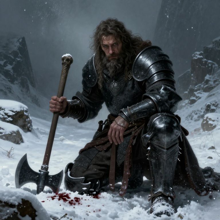 Photorealistic digital artwork of a rugged, bearded man with long, disheveled dark hair, kneeling in a snowy landscape. He wears ornate, dark metallic armor with intricate engravings and a fur-lined cape. His right hand grips a large, double-edged battle axe with a blood-stained blade, planted in the snow at his side. Snow-covered rocks and misty, mountainous cliffs form the background, creating a cold, medieval atmosphere. His intense, focused gaze and grim expression convey determination and resilience. The image uses a cool color palette dominated by whites, grays, and dark metallics.