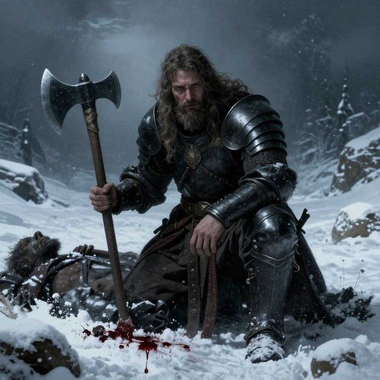 Bearded Viking warrior in silver armor kneels in snowy mountains, holding bloody axe, intense expression, misty background, digital art.
