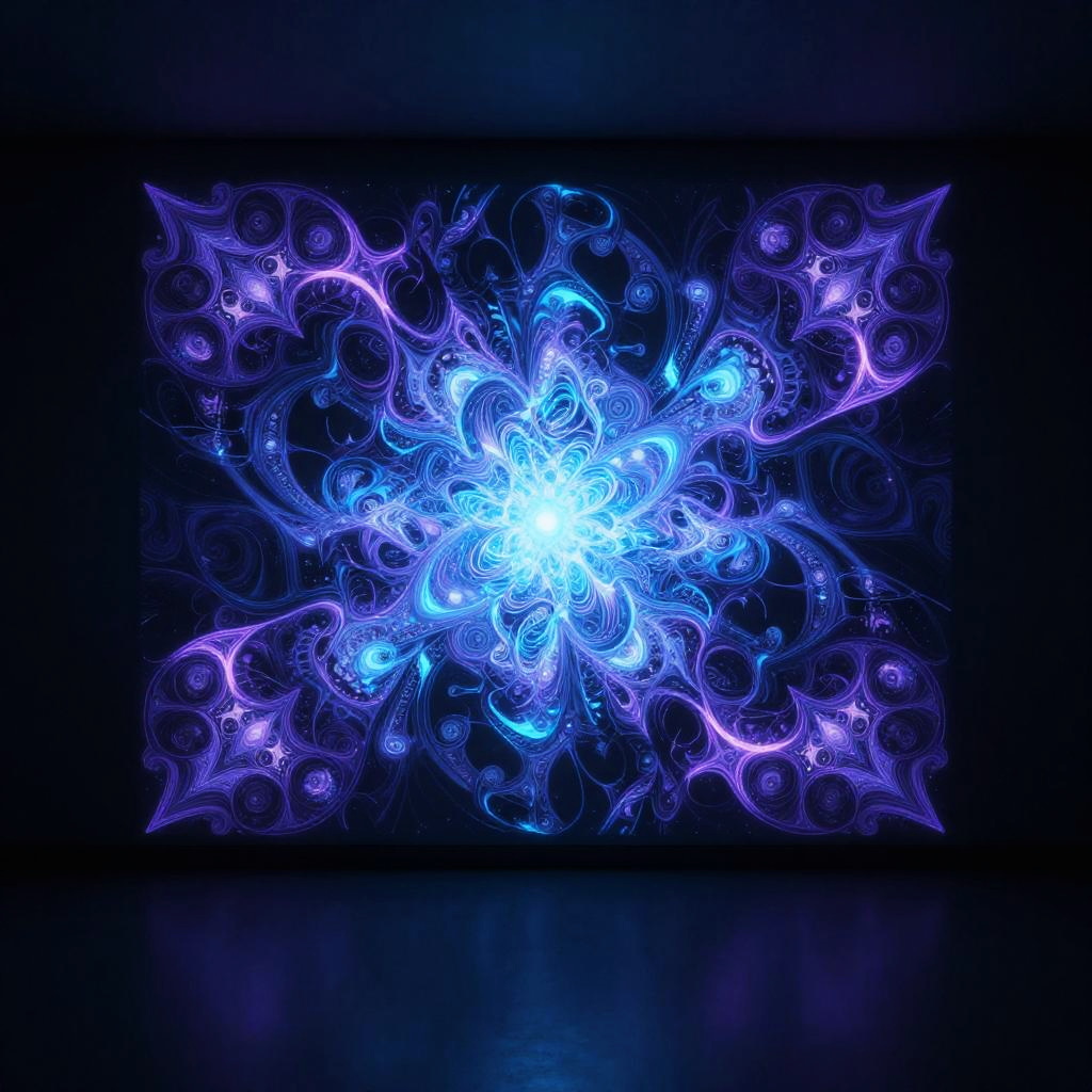 A digital artwork featuring a vibrant, abstract pattern on a black background. The central focus is a bright, glowing blue light surrounded by intricate, swirling lines and shapes in shades of purple and blue. The design resembles a fractal or a cosmic explosion, with delicate, lace-like textures radiating outward. The colors are vivid, with the blue light creating a luminous effect that contrasts sharply with the dark background. The overall style is futuristic and ethereal, evoking a sense of energy and movement. The image is symmetrical and visually striking.