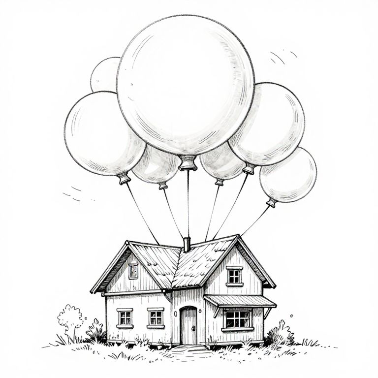 Black and white sketch of a small house with five large balloons tied to its roof, floating upwards. Detailed roof and windows, simple background.